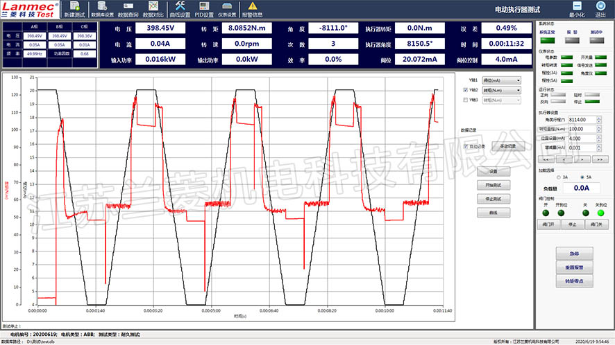 執行器測試軟件是基于PC(Windows 7 SP1)用來測試執行器性能的的數據采集軟件。測試軟件配合電參數儀表、轉矩轉速采集儀、程控加載儀等儀表可以對被測閥門進行手動加載、自動加載、曲線加載、定點測試、耐久測試等測試項目。 軟件具體功能如下: 5.1可顯示、保存、打印: 被測執行器輸入的電流、電壓、功率因數、電功率 輸出的轉矩、轉速、功率;效率;旋轉角度 各參數及相互之間的曲線關系,并形成報表予以保存和打印 5.2 可以顯示:執行器自帶的開度、扭矩傳感器顯示(2路4~20mA),并計算執行器的死區。 5.3 可以發送指令控制執行器的位置(4~20mA對應位置); 5.4 壽命測試,觸點輸出。可以發送指令命令執行器循環動作的啟動、停止;可面板和上位機切換控制執行器的動作。 5.5加載方式:手動、程控加載預驗收(均由乙方免費提供) 整機驗收 甲方提供被測執行器,安裝于成套測試臺,進行加載動態測試,觀察加載、顯示是否正常,有無異常振動、噪音。 乙方提供出廠資料: